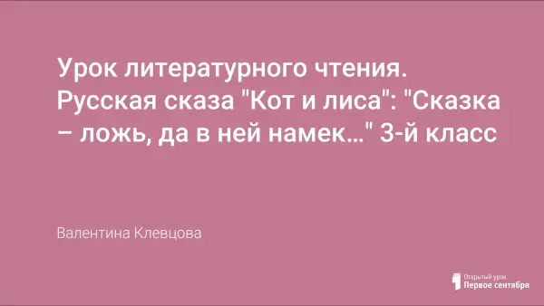 Урок в 3-м классе по программе «Школа-2100» призван познакомить с русской народной сказкой «Кот и лиса», учить чтению и восприятию русской народной сказки, пониманию смысла, учить читать текст по ролям; развивать интерес, навыки выразительного чтения, воспитывать способности определять свое отношение к героям сказки, любовь к искусству, развивать речь, словарный запас, творческое мышление учащихся, создать условия для развития познавательных способностей учащихся средствами литературного чтения.