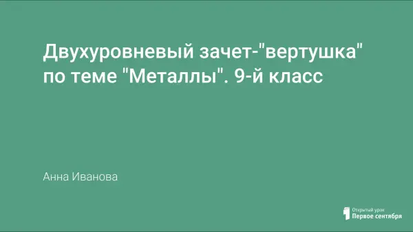 Представлен контрольный урок зачётного типа с разработанными дифференцированными заданиями (по двум уровням сложности), направленными на всеобъемлющую проверку знаний по теме "Металлы". Урок включает несколько этапов - проверку основных знаний по теме при помощи теста, теоретического опроса, проверку умений писать уравнения реакций, отражающих химические свойства металлов и способы их получения, а также умение решать расчетные задачи разного уровня сложности.
