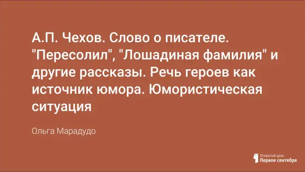 На уроке учащиеся знакомятся с биографией А.П. Чехова, его юмористическими рассказами, вводится понятие "юмористическая ситуация". Ученики приобщаются к богатствам отечественной литературы на примере чеховских рассказов.