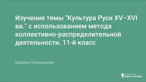 На конкретном примере из рабочей программы по истории для 11-го класса на тему «Культура Руси XV–XVI веков» представлено практическое использование коллективно-распределительной деятельности учащихся для формирования коммуникативных действий на уроке. Дается обоснование необходимости применения коллективно-распределительной формы сотрудничества учащихся на уроке как важном подготовительном этапе к индивидуальной познавательной деятельности школьника под руководством учителя.