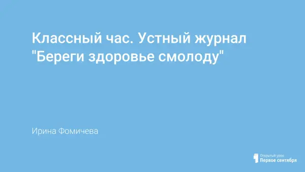 Классный час проходит в форме устного журнала. Занятие направлено на развитие у подростков осознанного неприятия к вредным привычкам как способов воздействия на свою личность; определения компонентов здорового образа жизни, влияния курения и алкоголя на здоровье человека. Класс делится на три команды, которые выполняют различные задания, соревнуются, зарабатывают жетоны, а результаты заданий размещают в экспресс-газете под названием "Береги здоровье смолоду".