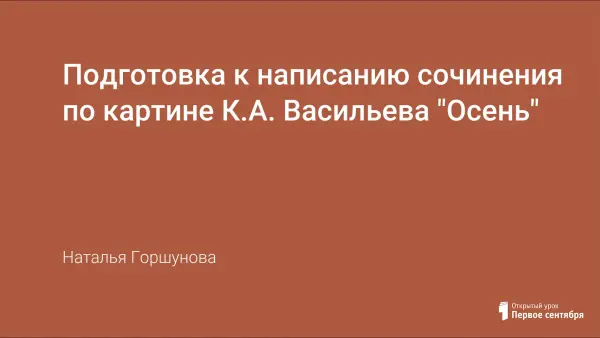 Цели урока: познакомить с творчеством художника, обучить школьников описывать пейзаж, изображенный на картине; развивать и совершенствовать навыки устной и письменной речи учащихся, умение выделять характерные особенности для описания пейзажа; воспитывать любознательность и наблюдательность, интерес к творчеству великого художника К.Васильева.