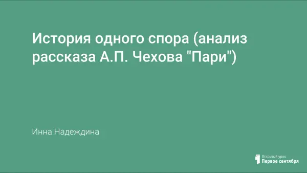 Целью урока является анализ рассказа А.П.Чехова, погружение в стилистику писателя. Как в уроке-мастерской, предлагается написать слова-ассоциации к слову «пари» и сделать предположение о роде и жанре произведения, написать возможный сюжет. Во время чтения учащиеся заполняют таблицу (банкир, юрист, автор), чтобы использовать выписанные слова для письменных ответов. В конце урока ученики составляют блок проблемных вопросов, которые помогут при написании домашнего сочинения.