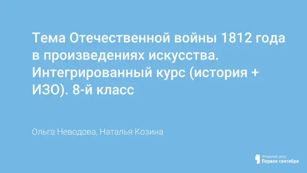 Представлен интегрированный урок по курсу "история + ИЗО", разработанная учителями истории и ИЗО с 5-й по 9-й класс. На уроке учащиеся познакомятся с произведениями искусства об Отечественной войне 1812 года. Показывается значимость Отечественной войны 1812 года для развития национального самосознания и искусства.