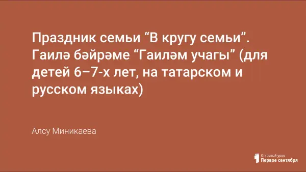 Конспект семейного праздника, выполненный на русском и татарском языках. Практической целью мероприятия является воспитание у детей чувства единства и сплоченности семьи. В ходе праздника дети вместе с родителями и воспитателем рассказывают стихи, поют песни о семье на русском и татарском языках, демонстрируют танцы, участвуют в сценических постановках. Все это способствует реализации творческих способностей воспитанников.