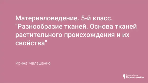 Занятие является первым в разделе изучения «Материаловедения» для 5-го класса. Направлено на целостное восприятие информации по тканям растительного происхождения с опорой на биологические и физические особенности растений, оказывающие влияние на технологические свойства тканей. Используются интерактивные виды деятельности и метапредметный подход к подаче информации.