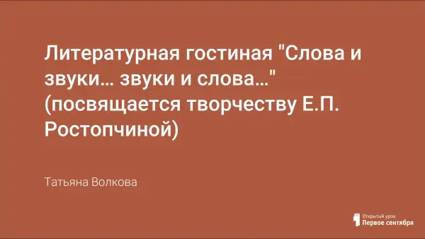 Литературная гостиная посвящается Евдокии Петровне Ростопчиной. Эта женщина, одарённая щедро от природы поэтическим воображением, веселым остроумием, простосердечной прямотой характера, при обширной начитанности на пяти языках, достигла вершин русской женской лирики Золотого века. Помимо работы над поэтическим текстом ребята обогащают свои знания через опыт общения со взрослыми людьми, приобретают опыт выступления на сцене.