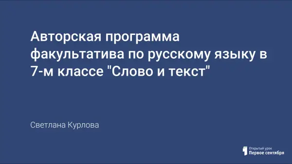 Авторская программа факультатива по русскому языку для учащихся 7-го класса рассчитана на 34 учебных часа. Занятия курса направлены на формирование устойчивых коммуникативных умений учащихся, создание текстов собственного сочинения, в том числе сочинений-рассуждений и сочинений на лингвистическую тему. На занятиях курса предполагается уделять большое внимание развитию речи учащихся, навыков и умений самостоятельного анализа предложенного текста.