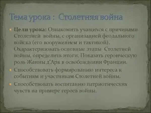 Цели урока: ознакомить учащихся с причинами Столетней войны, с организацией феодального войска (его вооружением и тактикой); охарактеризовать основные этапы Столетней войны, определить итоги; показать героическую роль Жанны д'Арк в освобождении Франции.