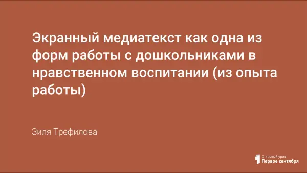 В этой работе для достижения целей и задач по нравственному воспитанию автор активно использует такую форму работы, как экранный медиатекст. Работая с медиатекстом ребенок учится думать, анализировать и высказывать свои суждения. Медиатекст позволяет развивать креативность детей.
