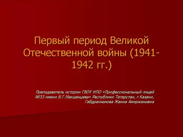 Данный урок способствует формированию у учащихся знаний об основных этапах Великой Отечественной войны, знакомит с подвигами героев Советского Союза. Для закрепления материала учащимся предлагаются задания, с использованием интерактивной доски. На уроке представлены также презентации обучаемых, заранее подготовленные к данному уроку.