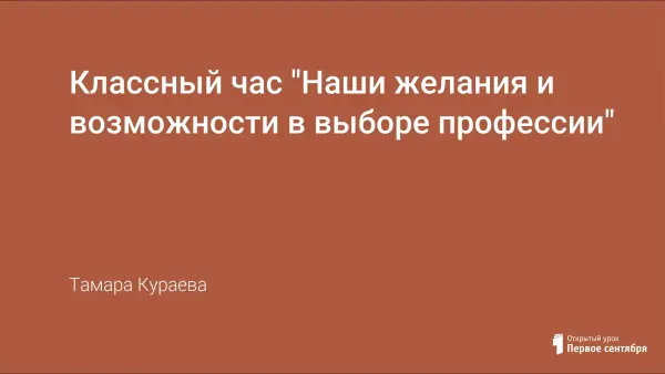 Данный классный час посвящен проблеме выбора профессии. Через игровые формы, тренинги, анкетирование, тестирование необходимо подвести учащихся к выводу, что к выбору профессии нужно отнестись очень серьезно. Результаты анкетирования по методике В.Б.Успенского «Готовность подростков к выбору профессии» и тест на определение склонностей к определенному типу профессии могут помочь учащимся сделать правильный выбор.