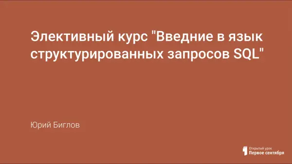 Необходимым и достаточным условием для работы с любой базой данных является знание языка запросов и умение использовать язык запросов для поиска любой информации. Рассматриваемый элективный курс направлен на расширение знаний выпускника средней школы и формирование умение работать с базами данных с применением языка запросов SQL.