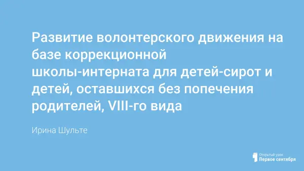 В статье рассказывается о работе волонтеров, активистов молодежного движения из различных учреждений, общественных организаций, благотворительных фондов с детьми-сиротами с ОВЗ. Автор пишет, как вовлекаются в волонтерское движение воспитанники школы-интерната. Особый интерес представляет совместный опыт работы педагогов коррекционной школы-интерната с педагогическими коллективами общеобразовательных учреждений по взаимодействию школьников с ОВЗ и их сверстников.