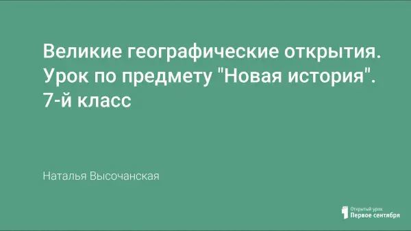 Урок является составляющей частью курса «Новая история». Урок изучения нового материала с использованием мультимедийной презентации "Великие географические открытия" построен на выступлениях учащихся, работе с учебником и источником. Одной из основных целей урока является формирование навыков самостоятельной работы учащихся, умения устанавливать причины, следствие и значение исторических событий, умения выступать перед аудиторией.