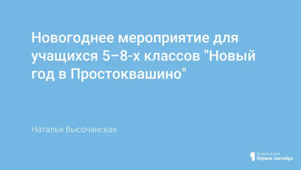 Праздничные действия происходят в селе Простоквашино, где ребят ждет встреча с его жителями: Матроскиным, Шариком, Печкиным, Галчонком. Сказочные герои приготовили веселое новогоднее представление и игры для ребят. Представленный сценарий позволяет вовлечь в подготовку и участие в празднике всех учащихся, что дает возможность каждому ребенку проявить все свои индивидуальные и творческие способности.