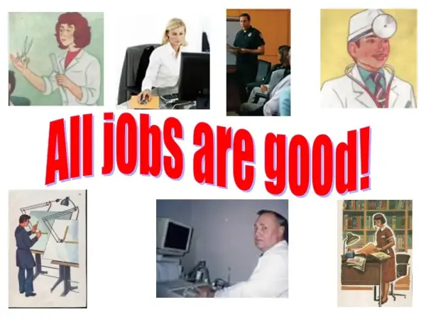 Цели урока: активизация лексики по теме урока; развитие навыков аудирования, чтения, устной речи; совершенствование навыков размышления по теме; обучение вопросно-ответной работе по теме. В ходе урока проводится отработка лексики по теме урока, совершенствование навыков размышления по теме и навыков изучающего чтения, развитие навыков устной речи, активизация лексики по теме. Используются картинки по теме, жетоны для игры «Аукцион», магнитофон, презентация по теме «All jobs are good».