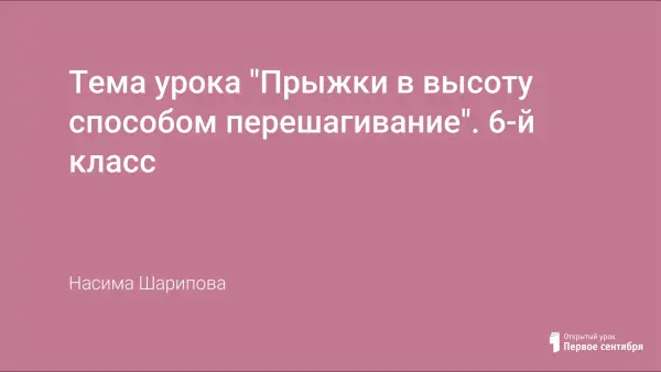 Урок физической культуры для 6-го класса по программе В.И. Ляха (IV четверть, 2-й урок) с целью научить учащихся прыжкам в высоту. Учащиеся совершенствуют низкий старт и стартовый разгон; обучаются технике прыжка в высоту способом «перешагивание» с 5–7 беговых шагов разбега. На уроке идет развитие двигательных качеств, быстроты, координации.