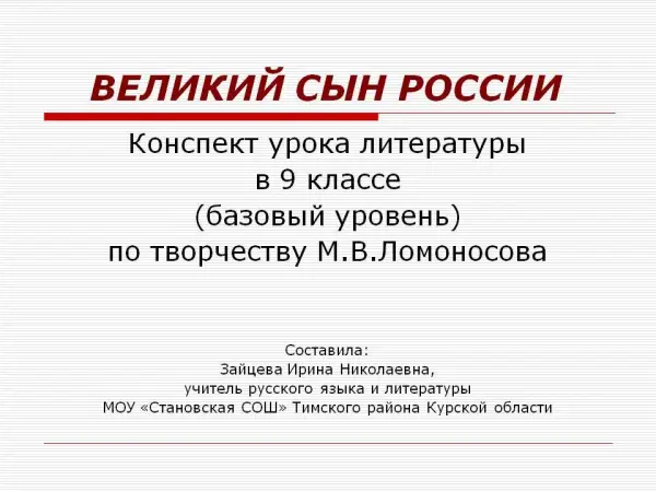 Урок обзорно знакомит учащихся с жизнью и творчеством М.В. Ломоносова как реформатора русского литературного языка и стиха. Занятие способствует развитию навыков анализа лирического текста, показывает многообразие путей осмысления стихотворного произведения, его идейно-художественного смысла. С целью систематизации полученных знаний по теме исследования на стадии осмысления используется один из видов развивающих канонов – кластер.