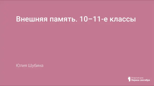Презентация предназначена для изучения в 10–11-м классе профильного уровня. Отдельные элементы презентации могут использоваться и в общеобразовательном классе. Презентация используется в течение урока на этапах объяснения нового материала и первичного закрепления знаний. Рассматриваются различные виды внешней памяти, их характеристики, преимущества в использовании и недостатки.