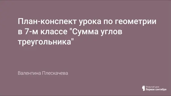 В работе представлен план-конспект открытого урока по геометрии в 7-м классе, посвященного изучению нового материала: доказательству теоремы о сумме углов треугольника, ее следствию и применению данной теоремы для решения задач, а также повторению аксиомы параллельности, признаков параллельности прямых. Урок способствует развитию элементов геометрического мышления, воспитанию интереса к оперированию геометрическими понятиями.
