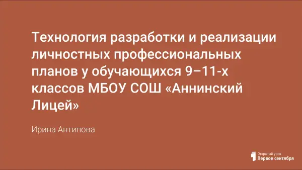 В статье обобщен накопленный опыт работы по технологии разработки и реализации личных профессиональных планов (ЛПП) у обучающихся 9–11-х классов. Цель данной технологии: научить старшеклассников разрабатывать и корректировать индивидуальные профессиональные планы в соответствии со своими индивидуальными ценностно-мотивационными установками, потребностями, склонностями, способностями, особенностями здоровья. Осуществление систематической комплексной работы по данной технологии способствует формированию осознанного выбора будущей профессиональной сферы или специальности у старшеклассников, а также осознанию своих личностных качеств, склонностей, способностей, формированию жизненно важных компетенций.