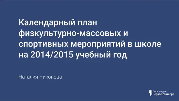 Календарный план физкультурно-массовых и спортивных мероприятий предназначен для использования в ОУ на учебный год, рассчитан на участие обучающихся в спортивных мероприятиях в течение учебного года. Позволяет получить и освоить знания и навыки по предмету «физическая культура»; способствует осознанному выбору вида спорта для дальнейшего самообразования и саморазвития. Целью проведения спортивных состязаний является содействие укреплению здоровья, развитию физической подготовленности и всестороннему развитию личности.