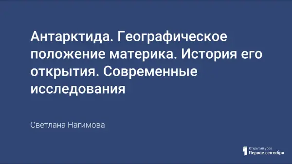 Учащиеся определяют физико-географическое положение материка; знакомятся с историей открытия и исследования Антарктиды – самого холодного материка и окружающих его вод; показывается вклад русских ученых в открытие и исследование Антарктиды.