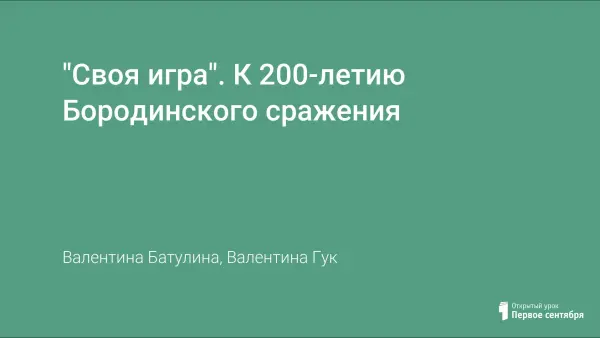 Своя игра проводилась с разновозрастными командами к 200-летию Бородинского сражения. Вопросы составлены по разным категориям: литература, искусство, оружие и обмундирование солдат в войне 1812 года, краеведение и история. Почти во всех заданиях содержится иллюстративный материал, это помогает отвечать на некоторые вопросы. Цель игры: расширить кругозор, повысить интерес учеников к истории и литературе, воспитывать патриотизм.