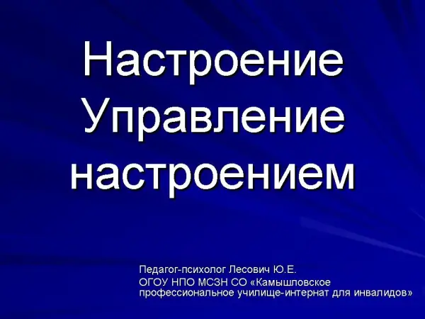 В беседе по теме раскрываются следующие вопросы: определение понятия «настроение», особенности настроения как эмоционального состояния, причины изменения и способы управления настроением.