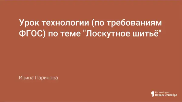 Урок соответствует требованиям ФГОС, сопровождается презентацией, наглядно излагает материал. Цель урока: не только научить выполнять простейшее лоскутное изделие в технике шитья из полос, но и развивать самостоятельное мышление и творческие способности в подборе материалов для изделия, гармоничных цветовых сочетаний в выбранных лоскутках тканей, а также научится грамотно обосновывать этот выбор.