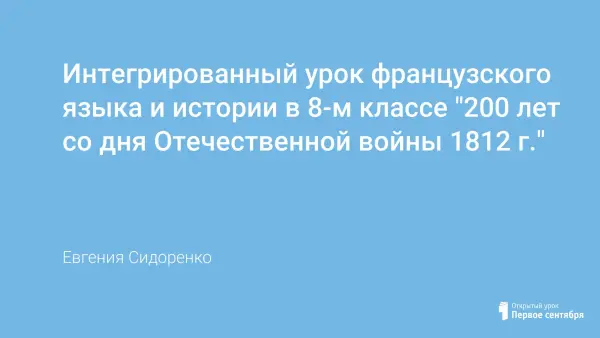 Интегрированный урок в 8-м классе рекомендуется провести в конце учебного года на этапе закрепления и обобщения пройденного материала. Цель урока – обобщение и систематизация умений и навыков разговорной речи на основе монологических и диалогических высказываний по теме. Отечественная война 1812 года – это одно из значимых исторических событий. На примерах биографий великих полководцев на уроке воспитывается патриотизм и интернационализм.
