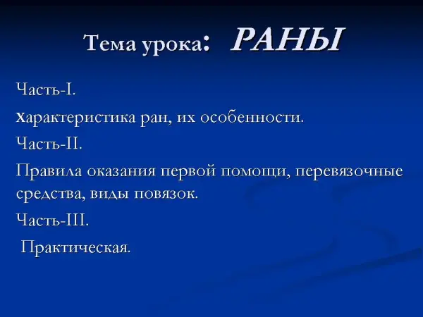 Методическая разработка включает в себя три урока – два теоретических и один практический. Основными задачами цикла следует считать получение представления о различных видах ран, которые возможно получить в повседневной жизни, ознакомление учащихся с задачами первой помощи при ранениях.