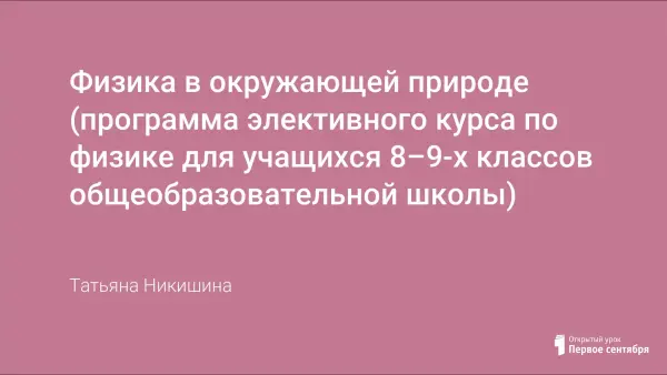 Входящий в школьный курс физики материал имеет глубокие и очень интересные обобщения. Элективный курс "Физика в окружающей природе" создан с целью интеграции, расширения, углубления и обобщения знаний учащихся о природе. Курс предназначен для предпрофильной подготовки учащихся 8-9-х классов.
