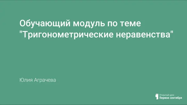 Модуль разработан с целью познакомить учащихся с решением тригонометрических неравенств. Презентация "Тригонометрические неравенства" в доступной форме дает представление о решении тригонометрических неравенств, дает возможность самостоятельного изучения темы, так как содержит пошаговую инструкцию.