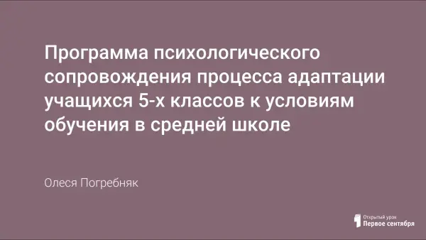Цель программы - способствовать психологической адаптации пятиклассников к условиям средней школы. Ожидаемые результаты занятий: снижение уровня школьной тревожности; позитивная динамика эмоционального развития ребенка, характеризующаяся возрастанием степени осознания чувств; гармонизация образа «Я»; повышение уверенности в себе и своих возможностях; формирование у детей позитивного отношения к школе, к учителям и одноклассникам.