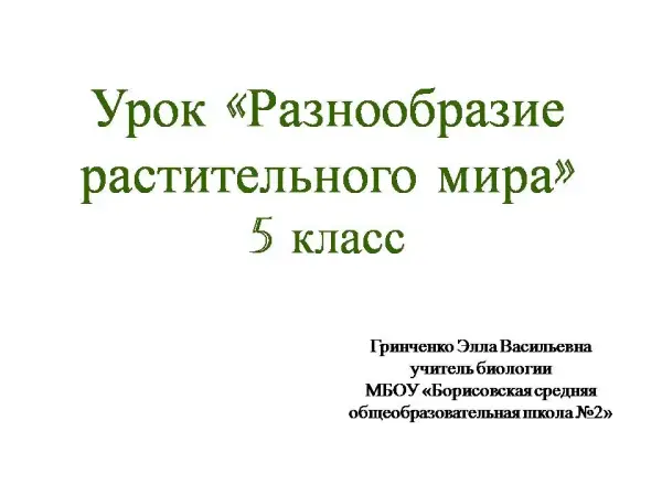 Урок в 5-м классе служит организации деятельности учащихся по изучению и первичному закреплению основных понятий классификации растений (одноклеточные и многоклеточные, цветковые и нецветковые, теневыносливые, светолюбивые, дикорастущие, культурные). Проверка выполнения домашнего задания проводится в виде цифрового диктанта. Во время урока используется работа с цифровым микроскопом.