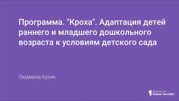 Программа «Кроха» – адаптационная программа к условиям детского сада для детей 1,5–3 лет, учитывающая психологические, физиологические и социальные особенности детей этого возраста и представляющая собой модель взаимодействия детского сада и семьи в этот непростой для ребенка период. В программе разработаны специальные мероприятия консультативного характера, призванные расширить психолого-педагогические знания и опыт родителей.
