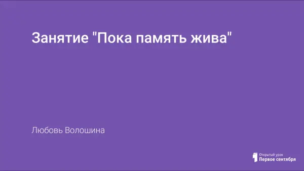 Занятие «Пока память жива» ставит целью вызвать у детей интерес к изучению истории страны и почтительное отношение к старшему поколению. Акцент делается на совместной работе с родителями воспитанников.