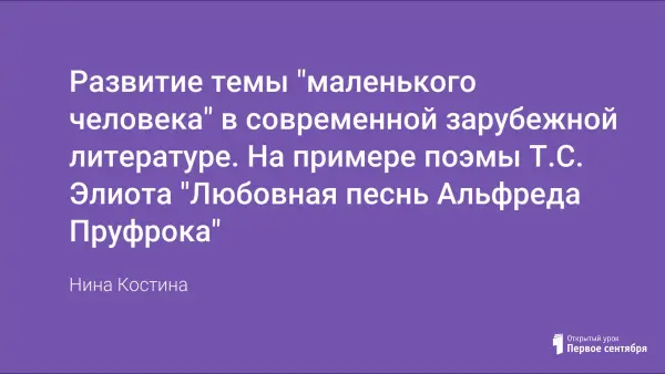 Урок знакомит с творчеством Т.Элиота, с общей характеристикой и своеобразием современной зарубежной литературы с точки зрения истории и литературы на примере поэмы «Любовная песнь Альфреда Пруфрока». Цели урока: показать особенности отражения темы «маленького человека» в современной зарубежной литературе; выявить злободневность и актуальность поэмы, привлечь внимание к проблеме «маленького человека»; проанализировать средства выразительности.