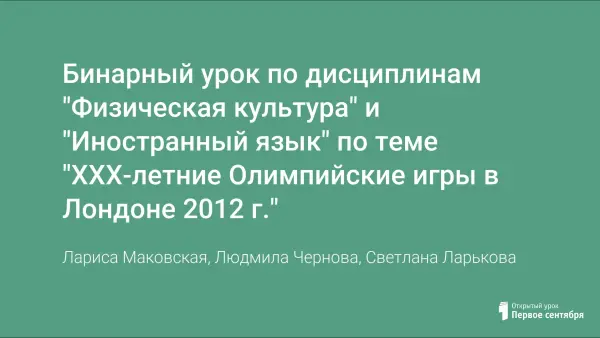Цель урока: исследование олимпийского движения в мире, в частности в России и Великобритании в XXI веке. Интеграция физической культуры и иностранного языка развивает интеллектуальные и физические способности студентов. При подготовке к уроку студентам предлагаются индивидуальные творческие задания: презентация по теме, подбор аудиозаписи, оформление стенгазет и плакатов, инсценировки торжественного открытия олимпиады.