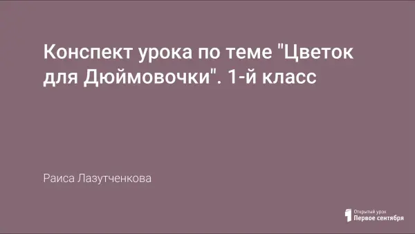 Цели урока: развивать творческие способности детей, учить видеть прекрасное в окружающем мире и передавать это в своих работах; познакомить с особенностями работы с гофрированной бумагой, учить делать цветы из гофрированной бумаги с помощью стержня, аккуратно приклеивать лепестки цветка к картону; повторить сюжет сказки "Дюймовочка" Г.Х. Андерсена, выбор момента сказки для передачи его в своей работе; воспитывать аккуратность в работе.