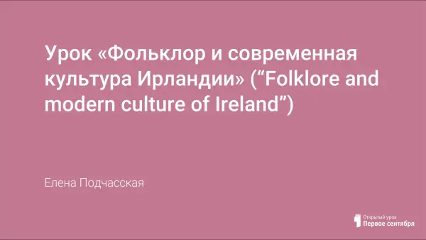 Урок посвящен изучению древней культуры Ирландии, а именно: фольклору и его влиянию на формирование культуры страны. Ирландский фольклор притягивает к себе своей лаконичностью и мелодичностью, красотой. Изучение фольклора помогает понять особенности ирландского народа и его отличие от других наций.