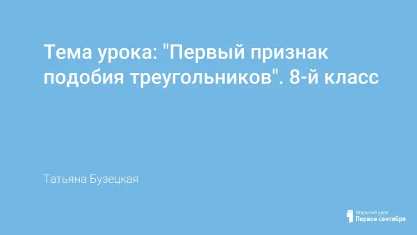 Урок сопровождается презентацией. Цель: закрепление знаний, умений и навыков учащихся по теме в решении задач; знакомство учащихся с первым признаком подобия треугольников; формирование у учащихся навыков применения этого признака при решении задач.