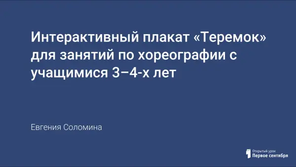 Интерактивный плакат для педагога-хореографа инструмент, направленный на возможность разнообразить учебное занятие по хореографии для детей возраста 3–4 лет, провести его в интересной, игровой форме. В статье представлен пример интерактивного плаката по сказке «Теремок», предложена информация как применять плакат на учебном занятии, создать аналогичный плакат, и какие информационные технологии можно использовать.