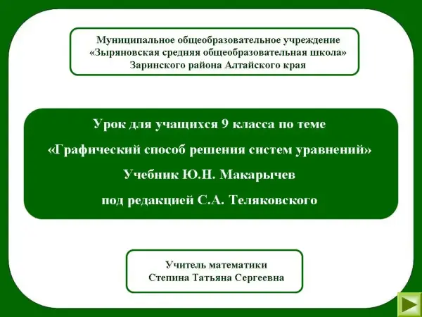 Урок разработан для класса, изучающего математику на базовом уровне по учебнику Ю.Н. Макарычева под редакцией С.А. Теляковского. Данный урок – первый из трех в изучении темы. Урок служит формированию умений и навыков решения систем уравнений графическим способом, выработке умений применять знания в незнакомой ситуации, способствует развитию логического мышления, математической речи, развивает интерес к предмету и самостоятельному творчеству.