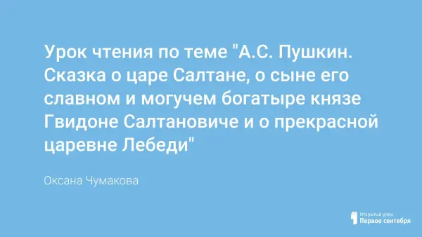 С самых ранних лет дети знакомятся со сказками А.С. Пушкина, знают строчки: "Белка песенки поёт...", "Ветер по морю гуляет...", "Свет мой, зеркальце, скажи, да всю правду доложи...". А строчки стихотворения "Я помню чудное мгновенье..." отражают самое лучшее состояние души и поэтому никогда не устареют. Ребята любят читать произведения Пушкина и поэтому достаточно легко запоминают их содержание. Урок чтения сказки А.С. Пушкина – это праздник общения с поэтом.