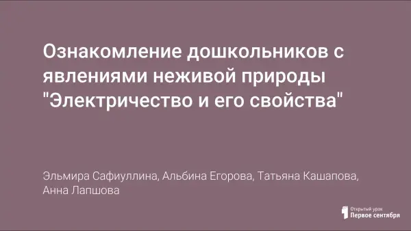 Ознакомление дошкольников с явлениями неживой природы (физическими явлениями и законами) занимает особое место в системе разнообразных знаний об окружающем. Оказывает свое влияние и непрерывно воздействует на развитие ребенка. Включает его в процесс поиска причины того или иного явления. На данном занятии обобщаются знания детей об электричестве, расширяется представление о том, где «живет» электричество, и как оно помогает людям.