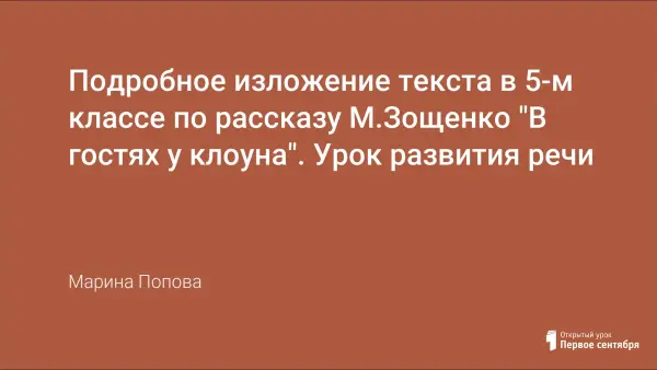 Материал представляет собой разработку урока по развитию речи учащихся в 5-м классе. Подробное изложение по рассказу М.Зощенко "В гостях у клоуна" поможет закрепить изученное по теме "Прямая речь. Диалог". На уроке ребята познакомятся с универсальной профессией клоуна, требующей разнообразных знаний и умений, вспомнят о необходимости заботливого отношения к "братьям нашим меньшим".
