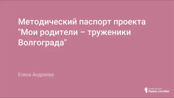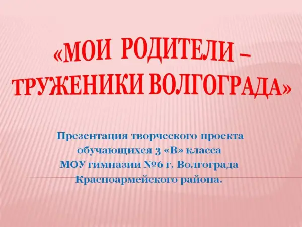 Цель проекта: узнать как можно больше о профессии родителей, сплочение коллектива детей, родителей и педагога. К работе над проектом было привлечено 60 % родителей класса. Ученики взяли у родителей интервью. Вопросы для анкеты составляли вместе с детьми. Возникла идея написать сочинение, нарисовать рисунки. Все материалы ученики оформили в альбом.